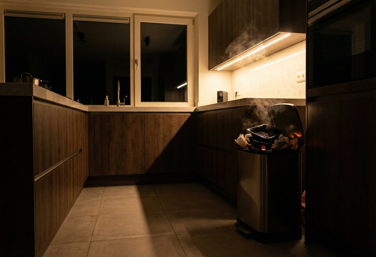 Verbrand voedsel voelt aan de buitenkant vaak koud genoeg om weg te gooien. Maar de kern kan gloeiend blijven, als een compacte braam van warmte. Gooi je die hete restanten in de prullenbak onder de gootsteen, dan stapel je warmte op tussen papier, plastic en karton. Brandweer Nederland waarschuwt al jaren voor dit soort restwarmtebronnen in huis: ze blijven verraderlijk lang actief en kunnen omliggend materiaal doen ontvlammen.